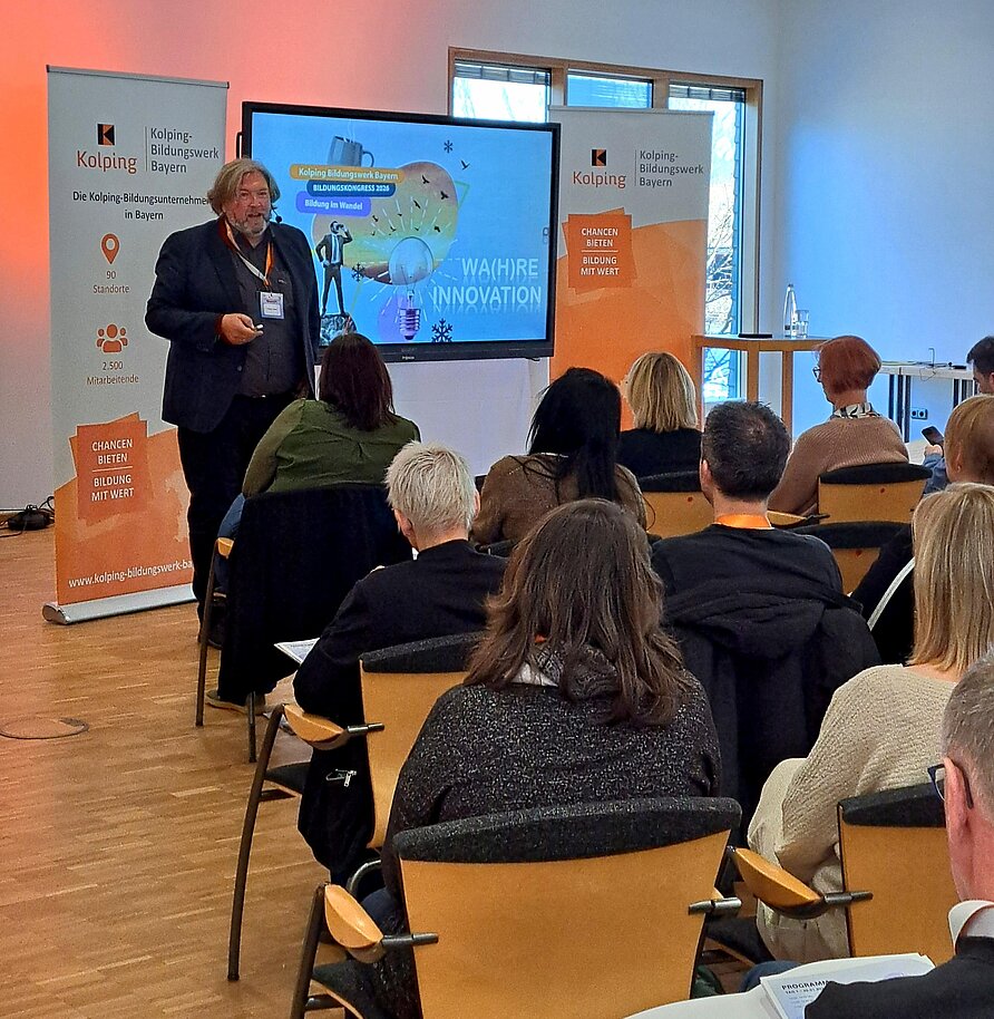 Nach der offiziellen Begrüßung durch Aufsichtsratsvorsitzenden Prof. Dr. Weber zeigte Thomas Huber, MdL und Vorsitzender des Aufsichtsrats des Kolping-Bildungswerkes Bayern, in seinem Impuls „Bildung im Wandel der Zeit“ die Herausforderungen der Zukunft für das Kolping-Bildungswerk auf.